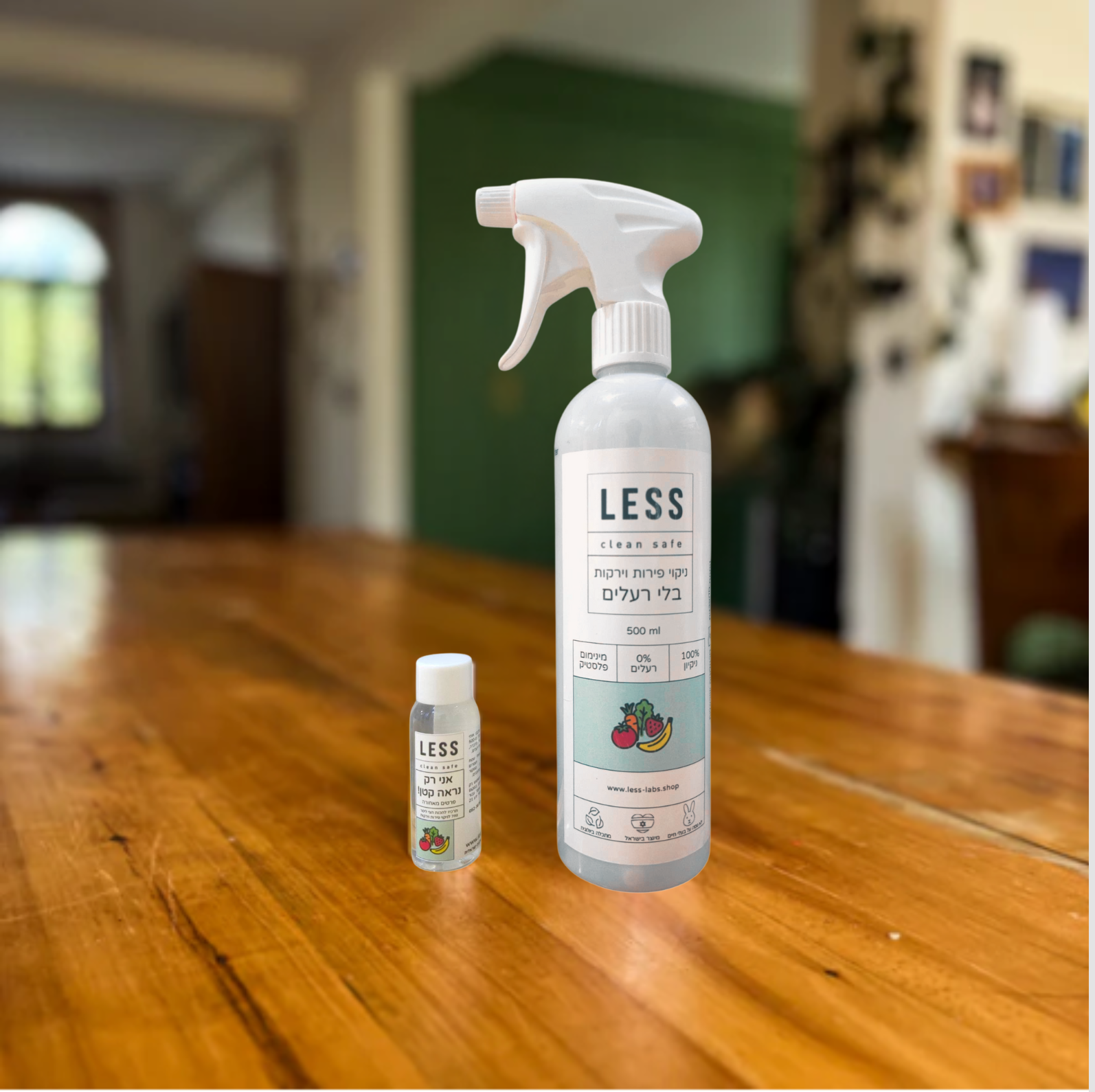 - ומה הסיפור עם המים? כל בקבוק פלסטיק חדש עולה לך כסף וחבל. התרכיז המהפכני של LESS עוזר לצמצם פלסטיק, אנרגיה ומקום בבית, וגם שומר על הכיס - ערבבו את בקבוקון התרכיז הקטן במים ותקבלו נוזל לניקוי פירות וירקות מעולה. בשניות.