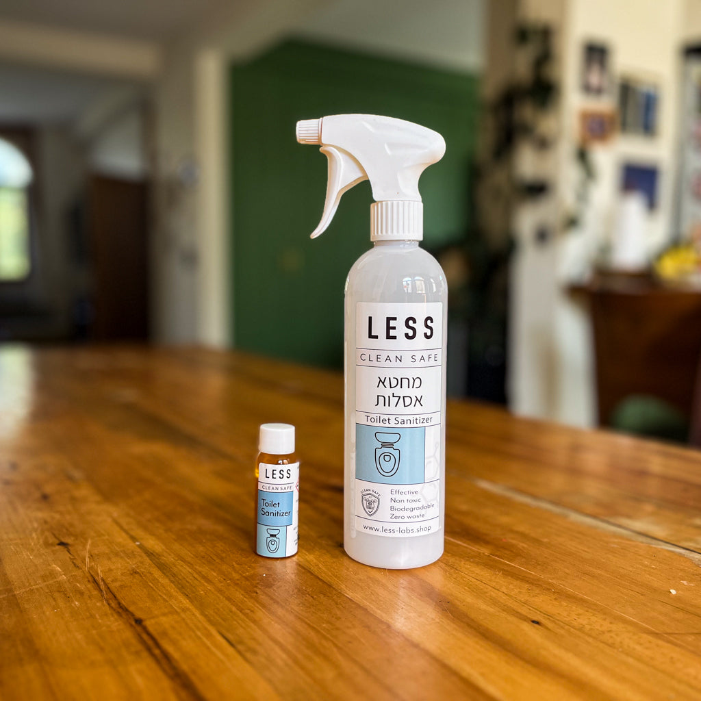 - ומה הסיפור עם המים? כל בקבוק פלסטיק חדש עולה לך כסף וחבל. התרכיז המהפכני של LESS עוזר לצמצם פלסטיק, אנרגיה ומקום בבית, וגם שומר על הכיס - ערבבו את בקבוקון התרכיז הקטן במים ותקבלו מנקה ומחטא אסלות חזק. בשניות.